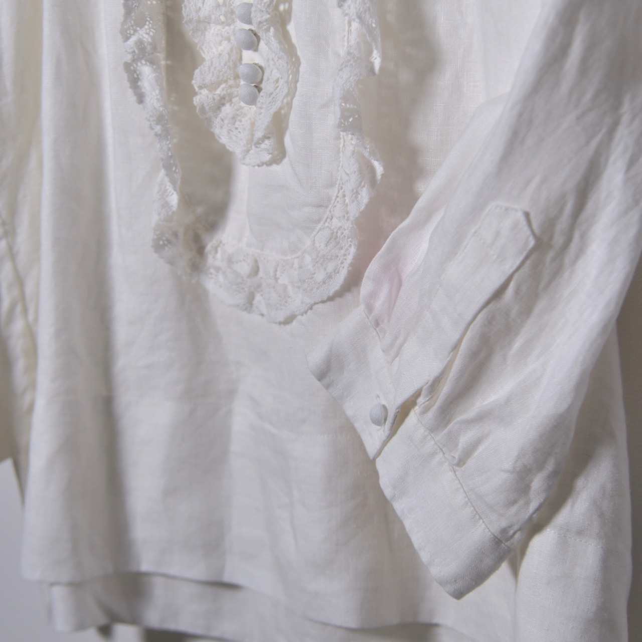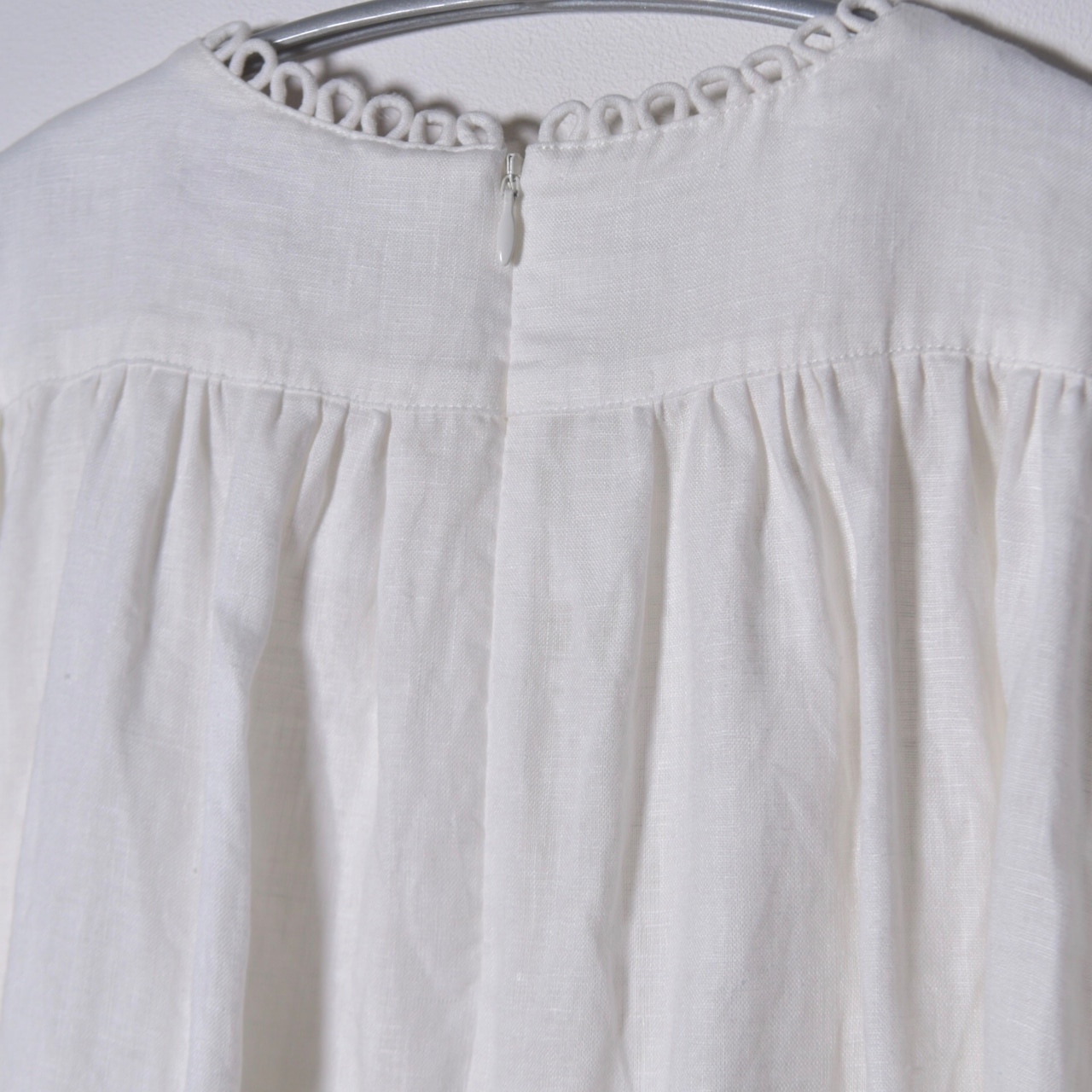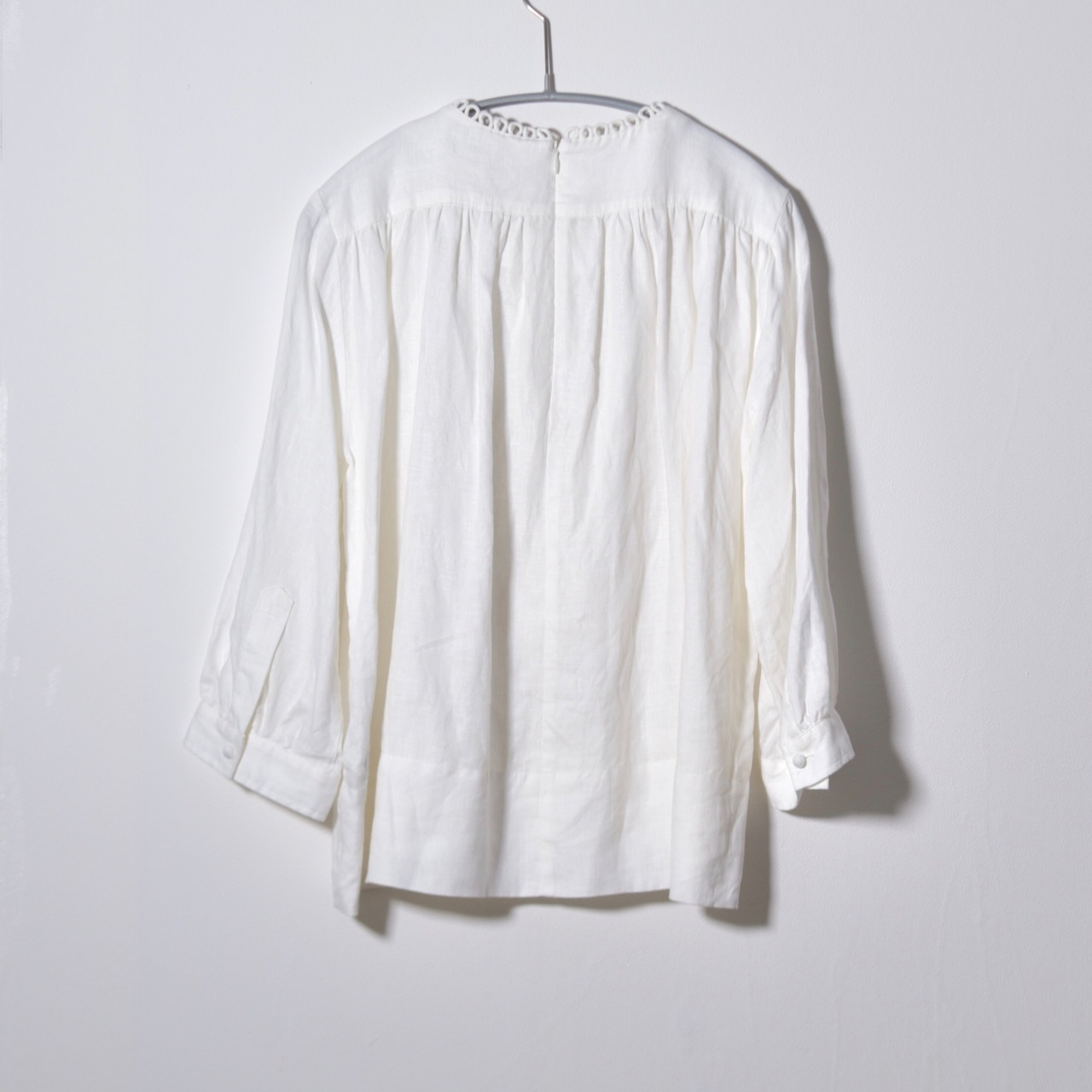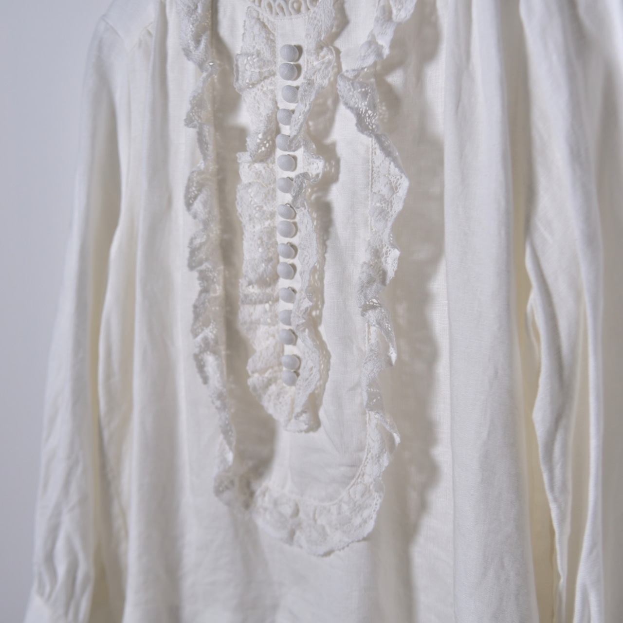 生地は清涼感のあるリネン素材に可愛らしいコットンレースのフリル使いです。 ゆったりめのパフスリーブに長すぎず短すぎないバランスのとりやすい着丈です。 ネックまわりからフロントまで手の込んだフリルやレース使い。ダリアならではの細部にまで拘ったディテールが詰まったブラウスです。着脱は後ろファスナーです。