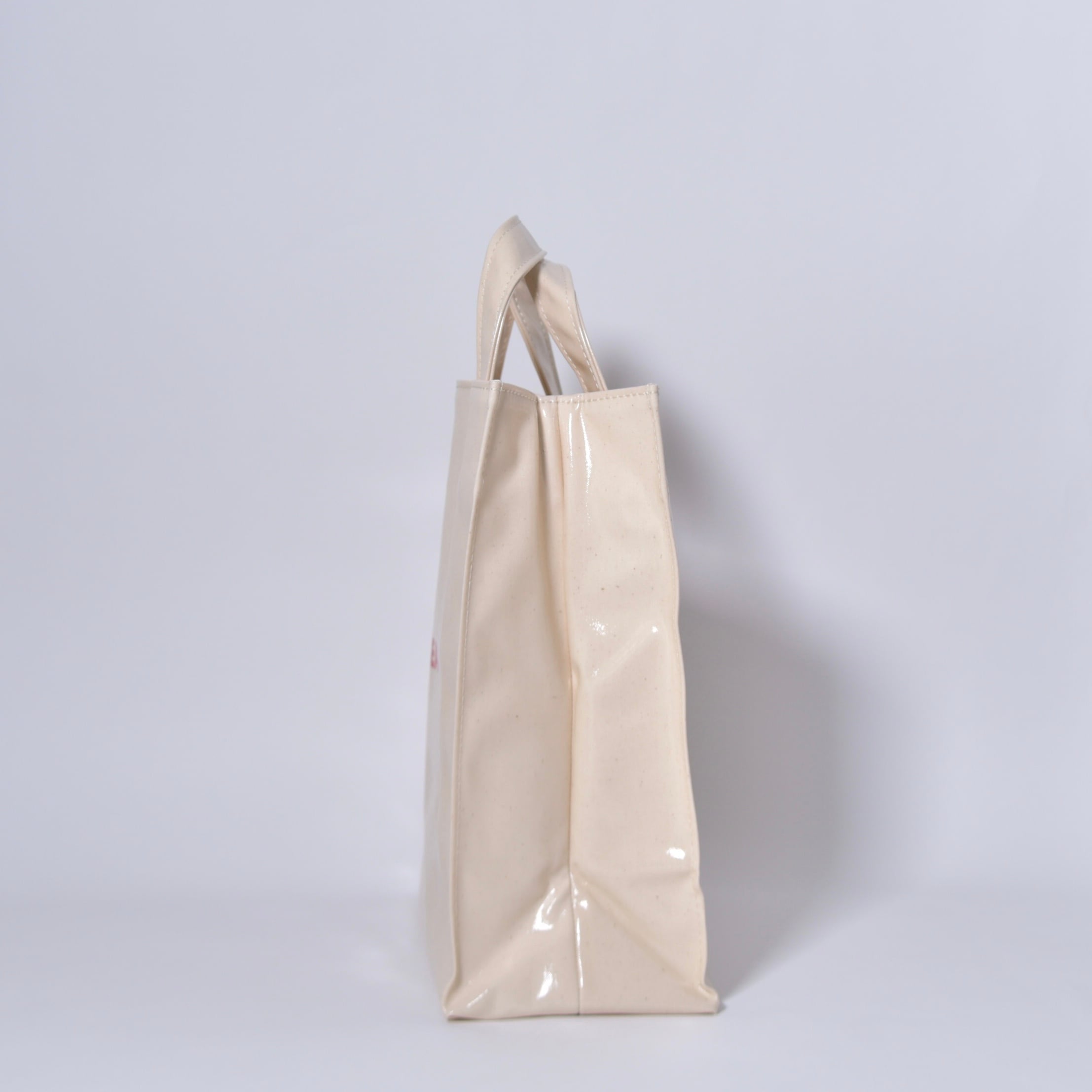 紙袋をイメージして作ったトートバッグ。11号のキャンバスにPVCコーティングを施し、防水性、耐久性を保たせています。 濡れても汚れてもサッと拭き取れるので、ちょっとした雨の日にも使えます。