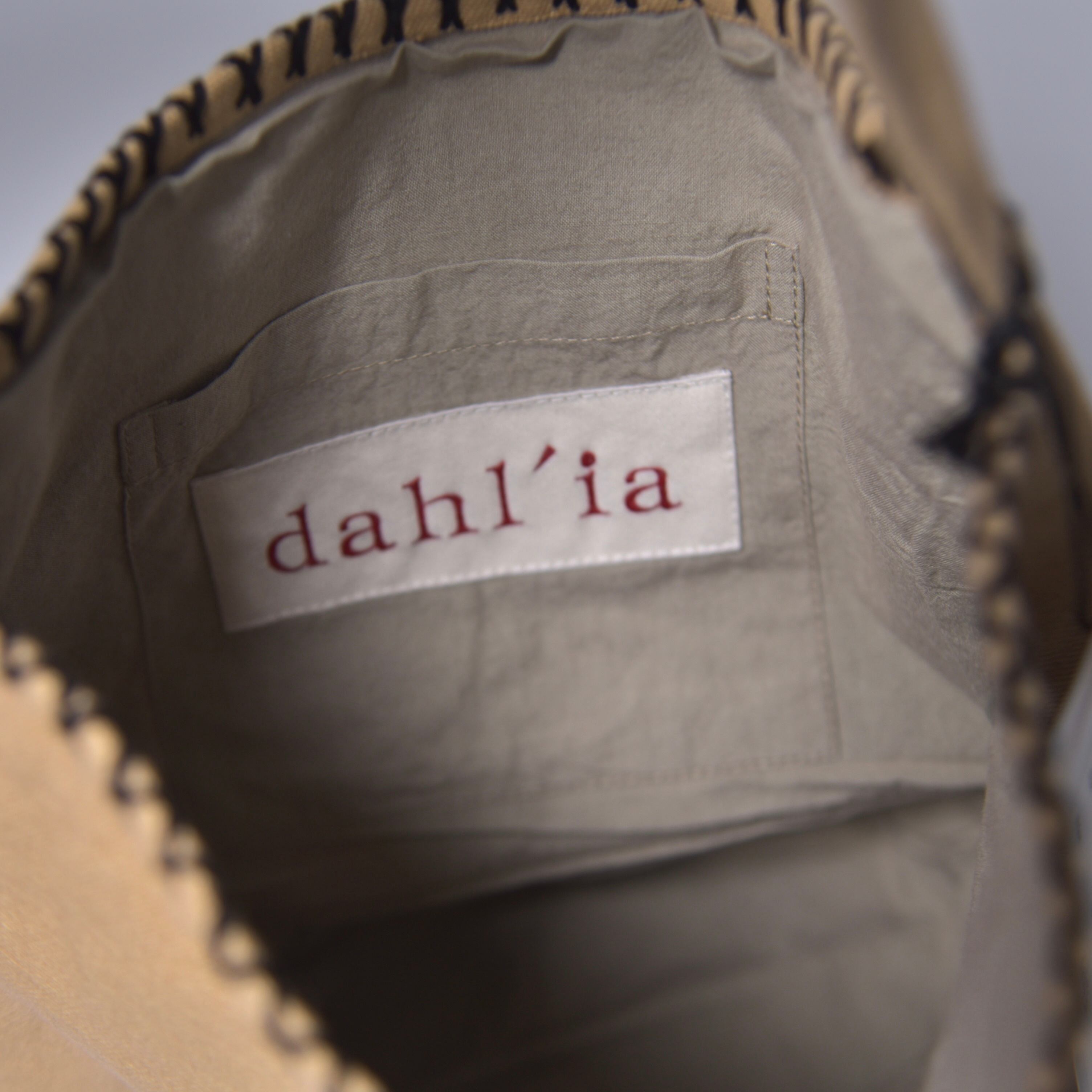 刺繍が施されたモノトーンのハンドバッグ。
