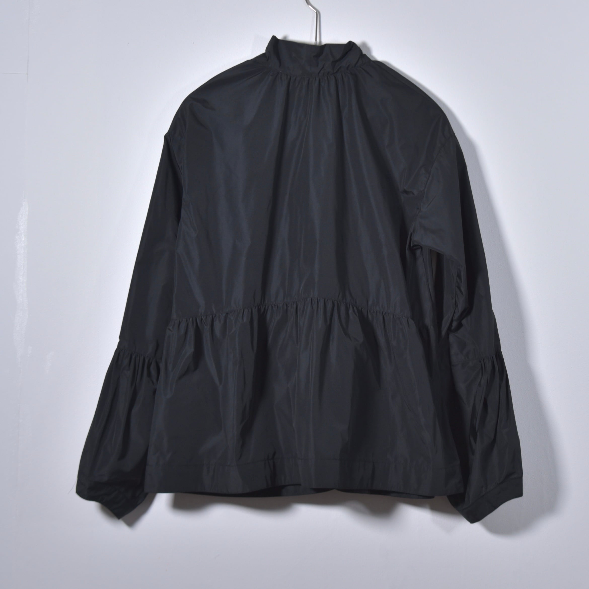 裾に向かって広がるフレアシルエットがフェミニンな印象を与えつつ、袖に施されたギャザーが全体のラインを引き締め、メリハリのある美しいシルエットを演出します。