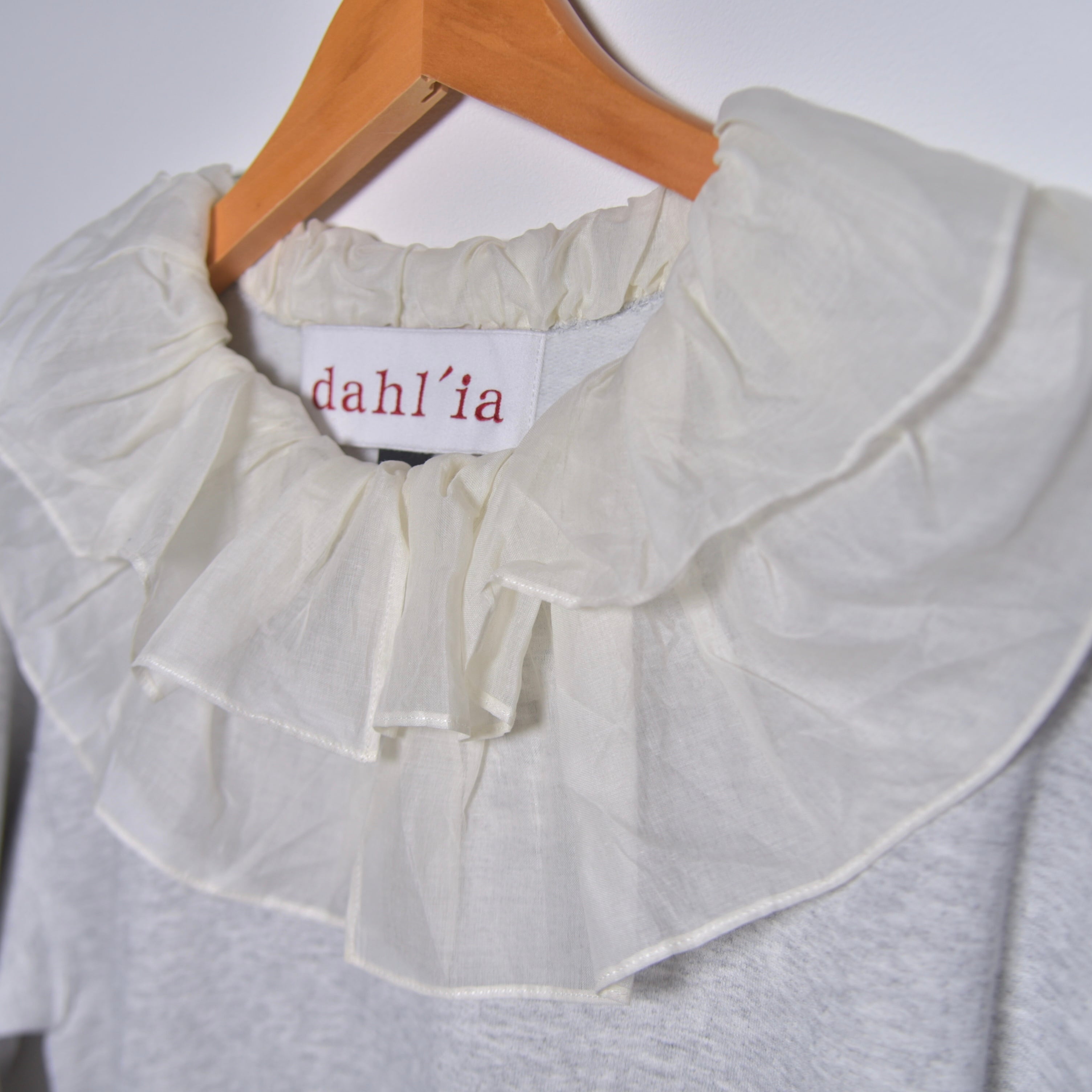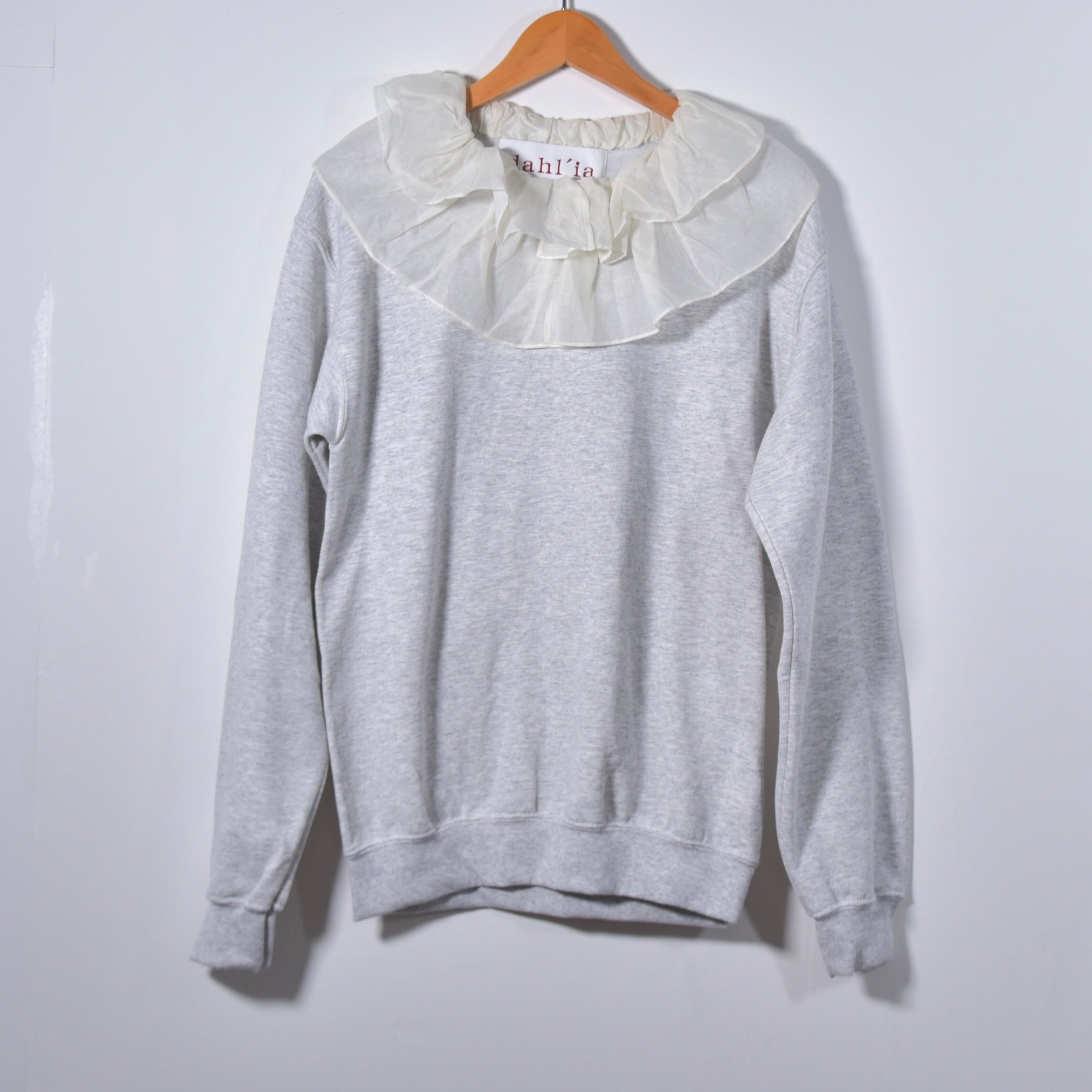 上品なライトグレーのスウェットに、繊細なホワイトのフリルカラーをあしらった一着。