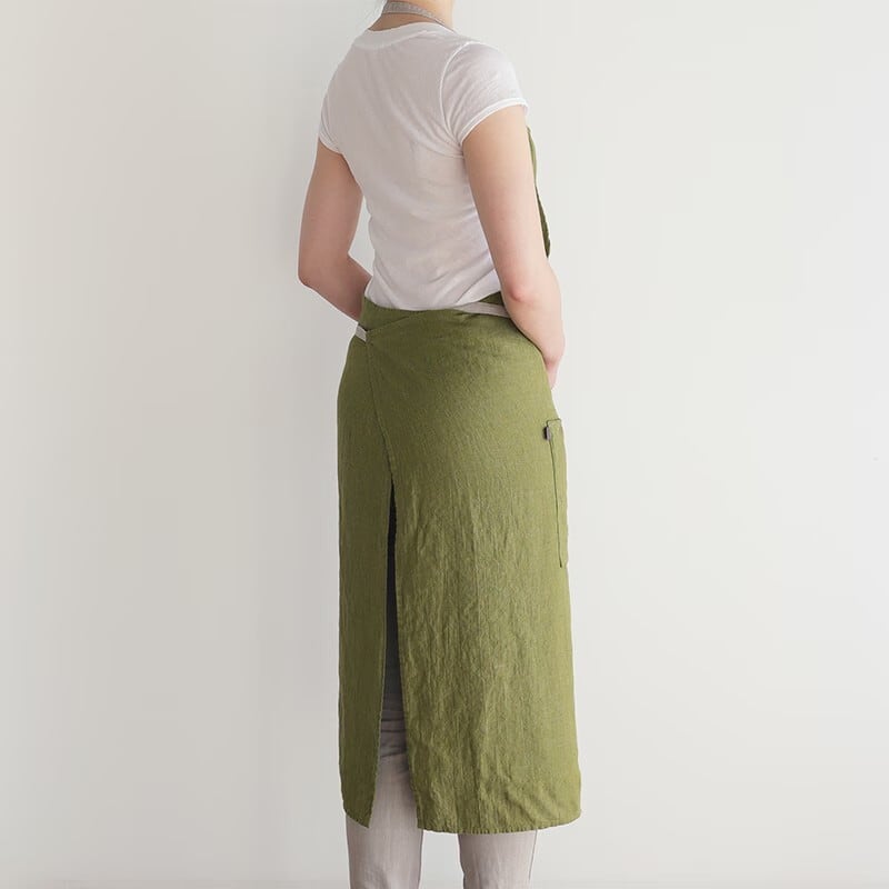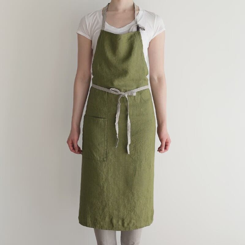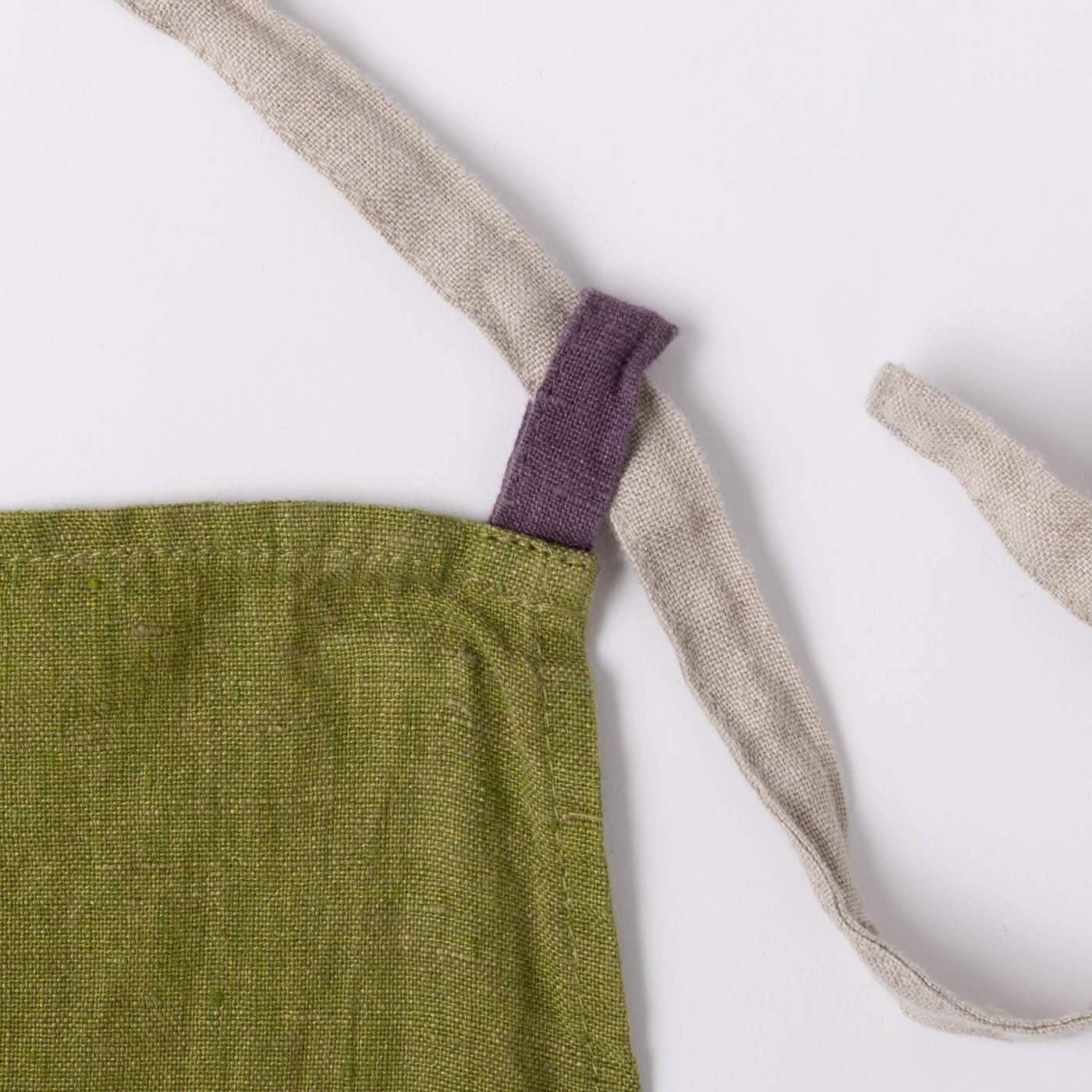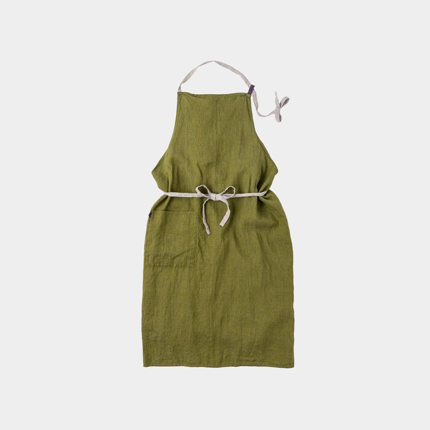 オリーブの実をイメージしたナチュラルで落ち着きのあるグリーンです。 少しくすみのあるカラーはどこかシック。首紐と腰紐のグレーで柔らかな印象に。 胸元とポケットの紫のタグもポイントです。
