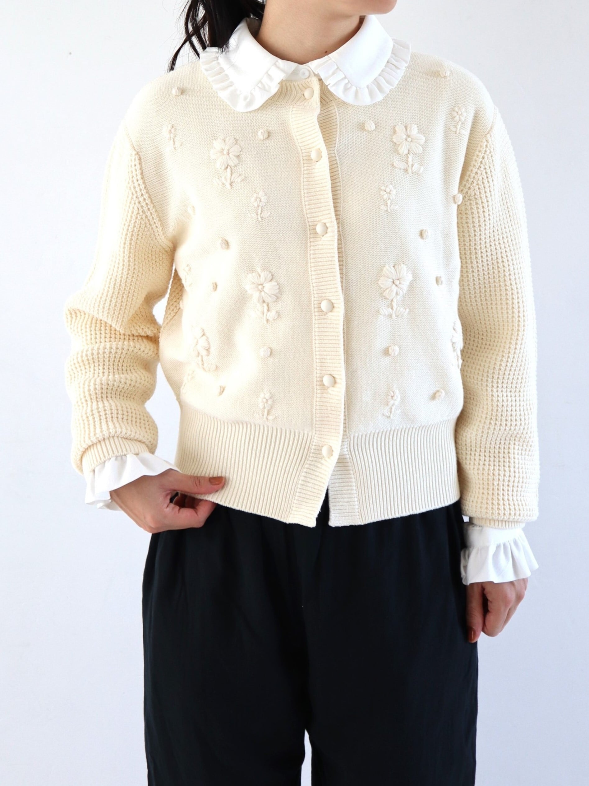柔らかく程よい厚さのニットカーディガンに、ハンド刺繍を前面に施した特別な一着です。