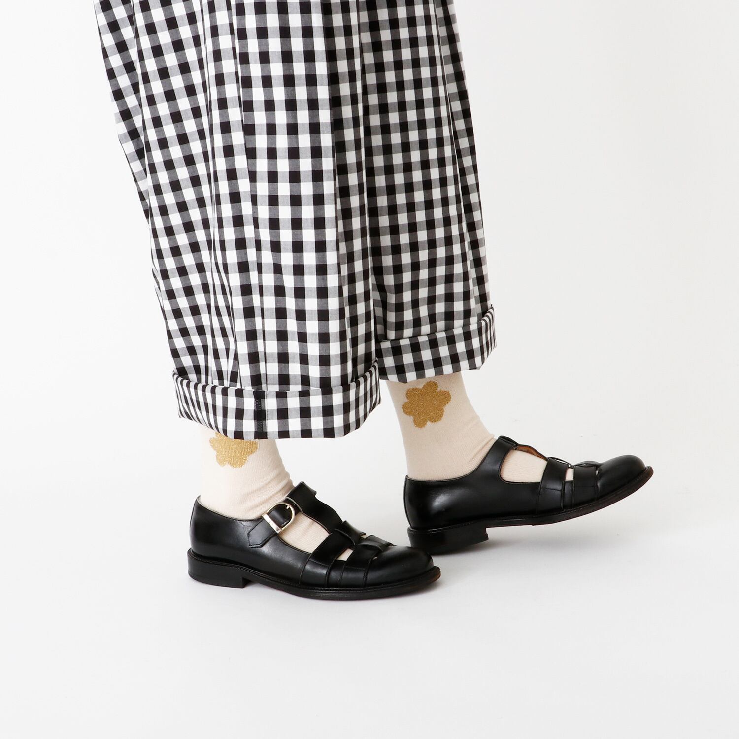 お花のワンポイント柄のソックスです。光沢感のある綿シルケット糸で、程よい厚みに編みたてました。花柄は片側をゴールドラメ糸で、もう片側をモノトーン色にあみわけ、左右で見えるカラーと印象を変えて楽しめます。