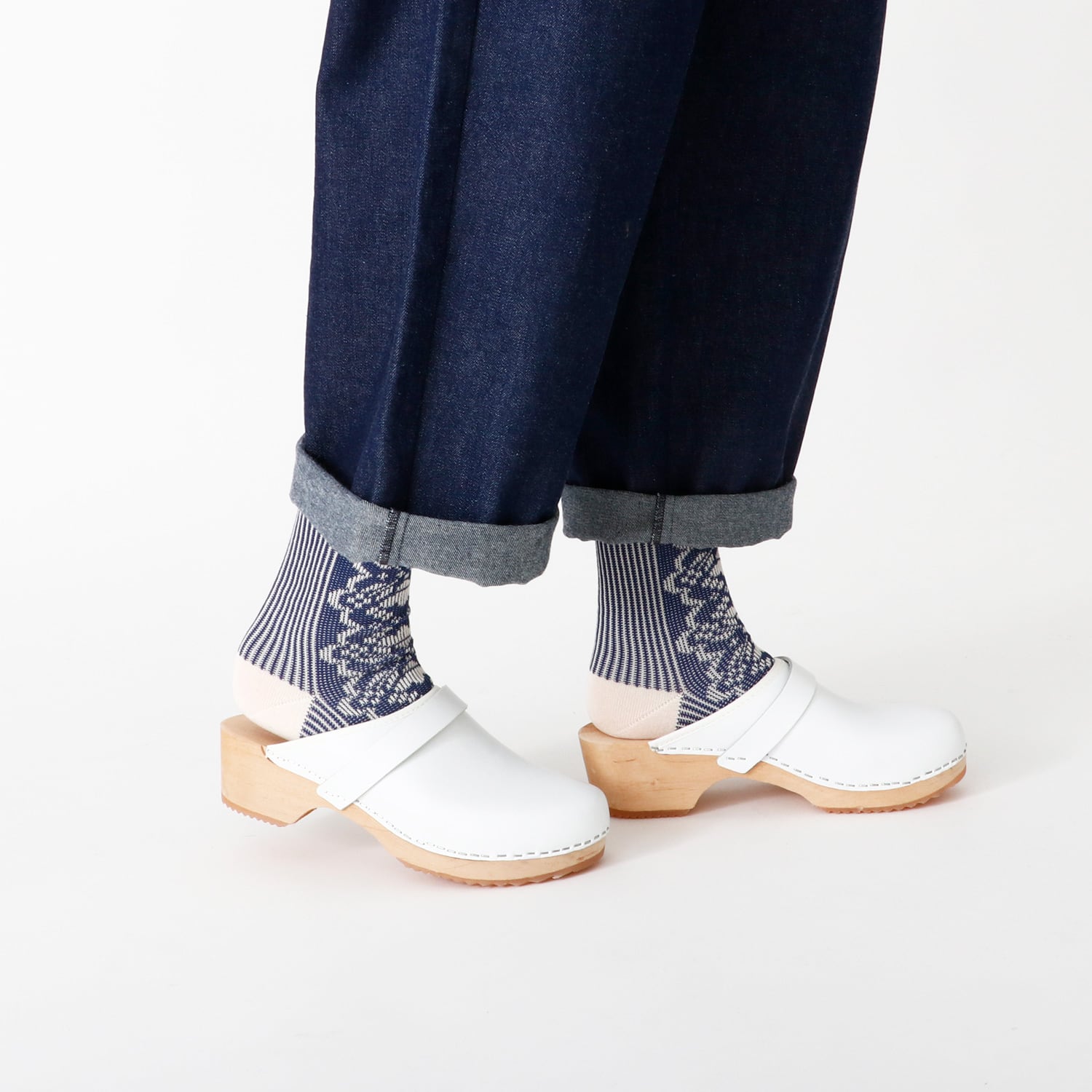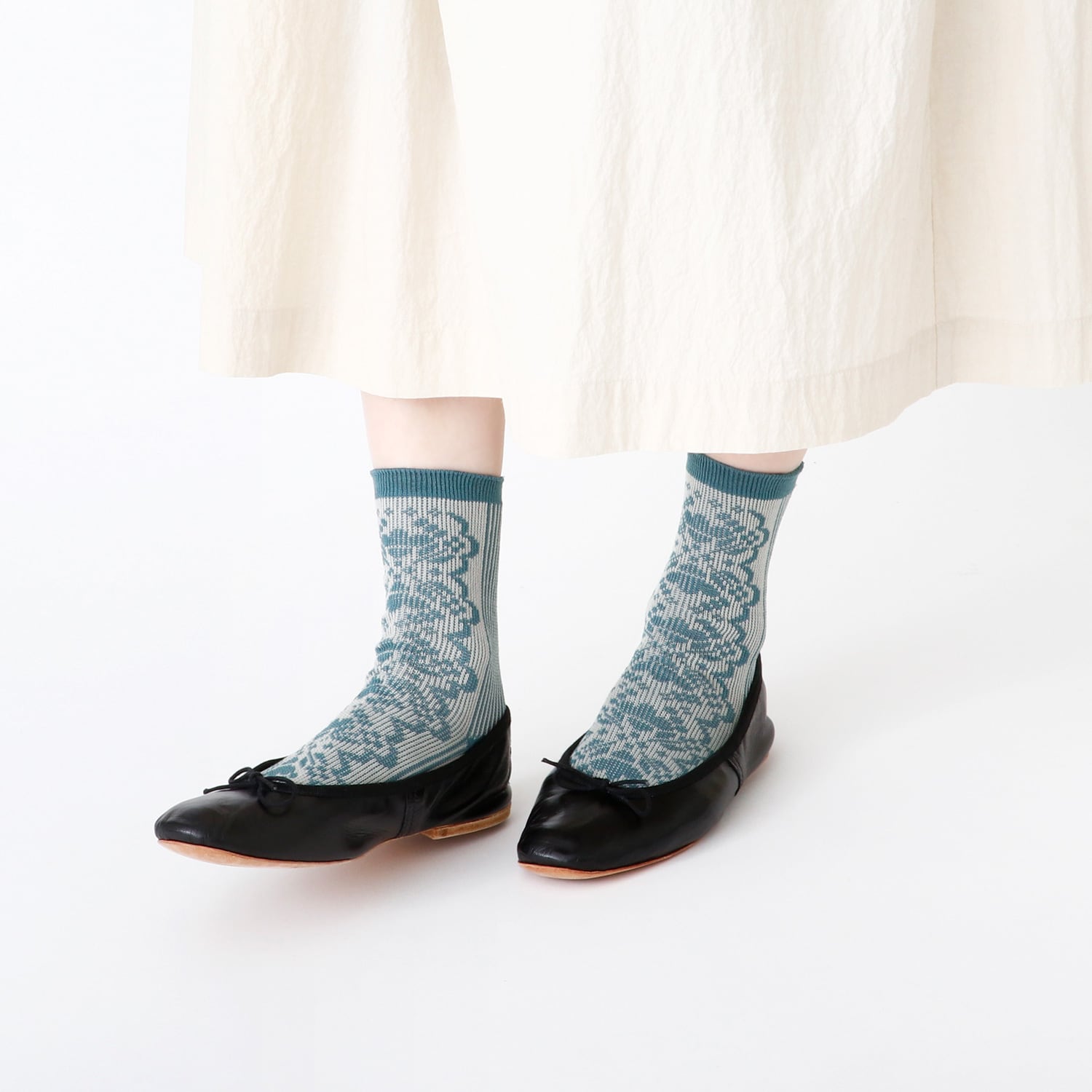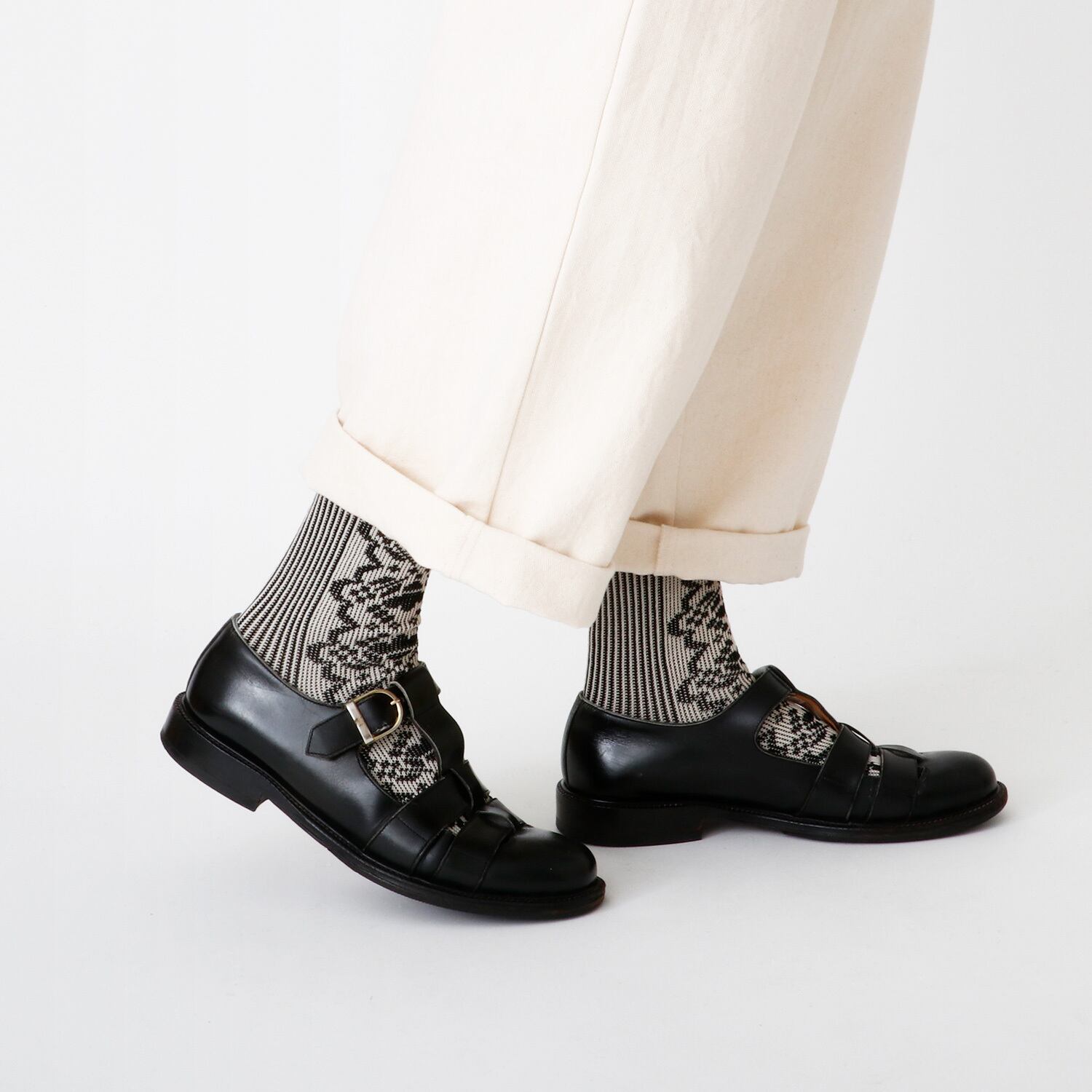 光沢感のある綿シルケット糸で、程よい厚みに編みたてました。前後で変わる柄が足元のポイントに。シックな配色でコーディネートに合わせやすい1足です。