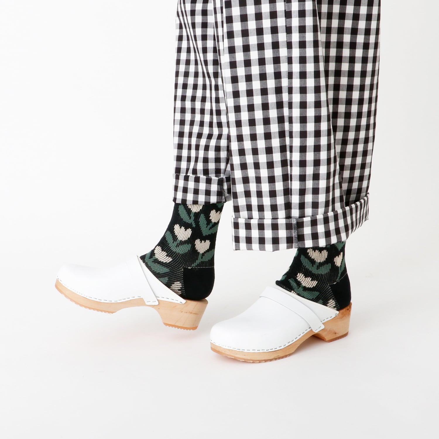 柔らかな綿糸で程よい厚みに編みたてました。ベーシックなベースカラーにポップな雰囲気のチューリップ柄が映え、足元を華やかにしてくれる1足です。