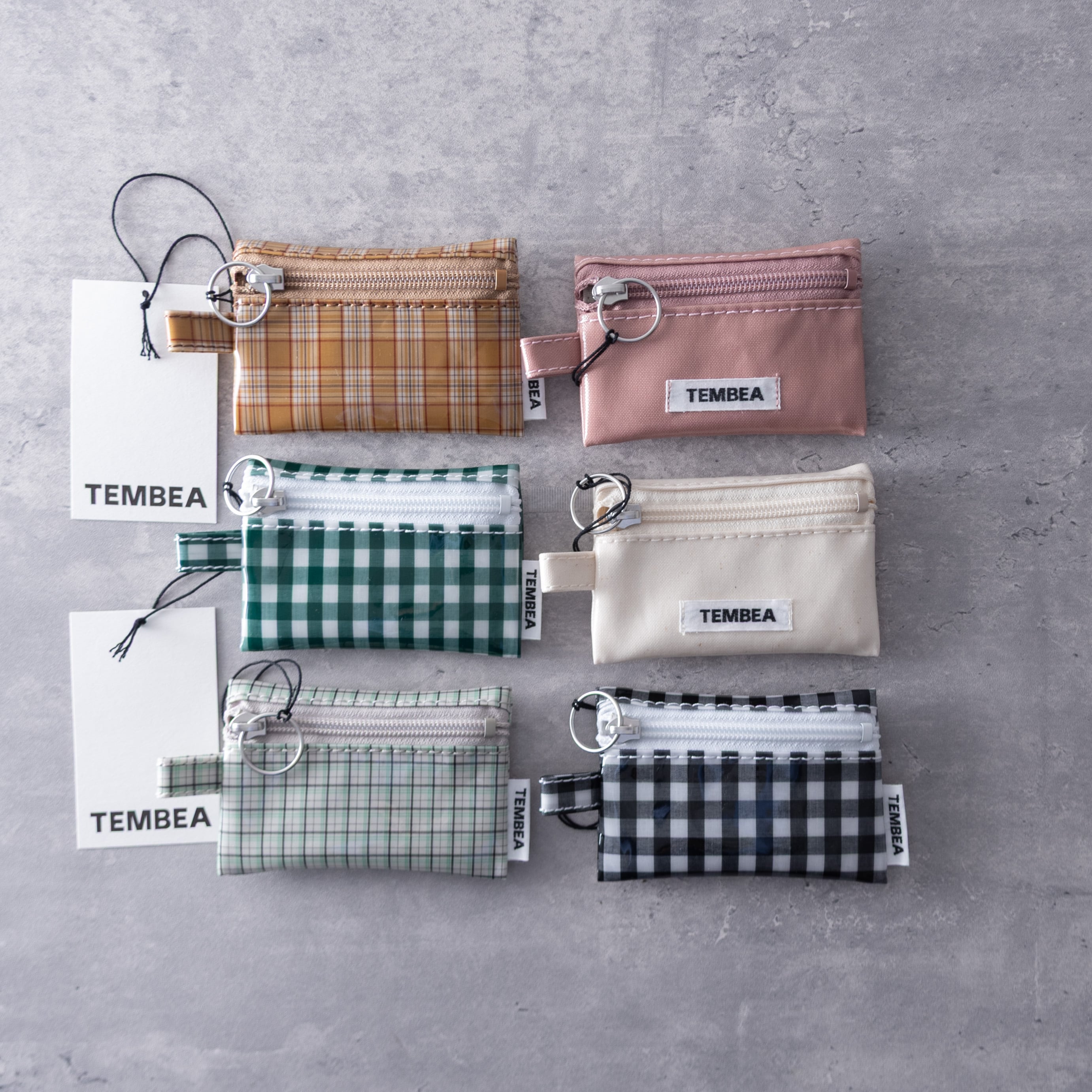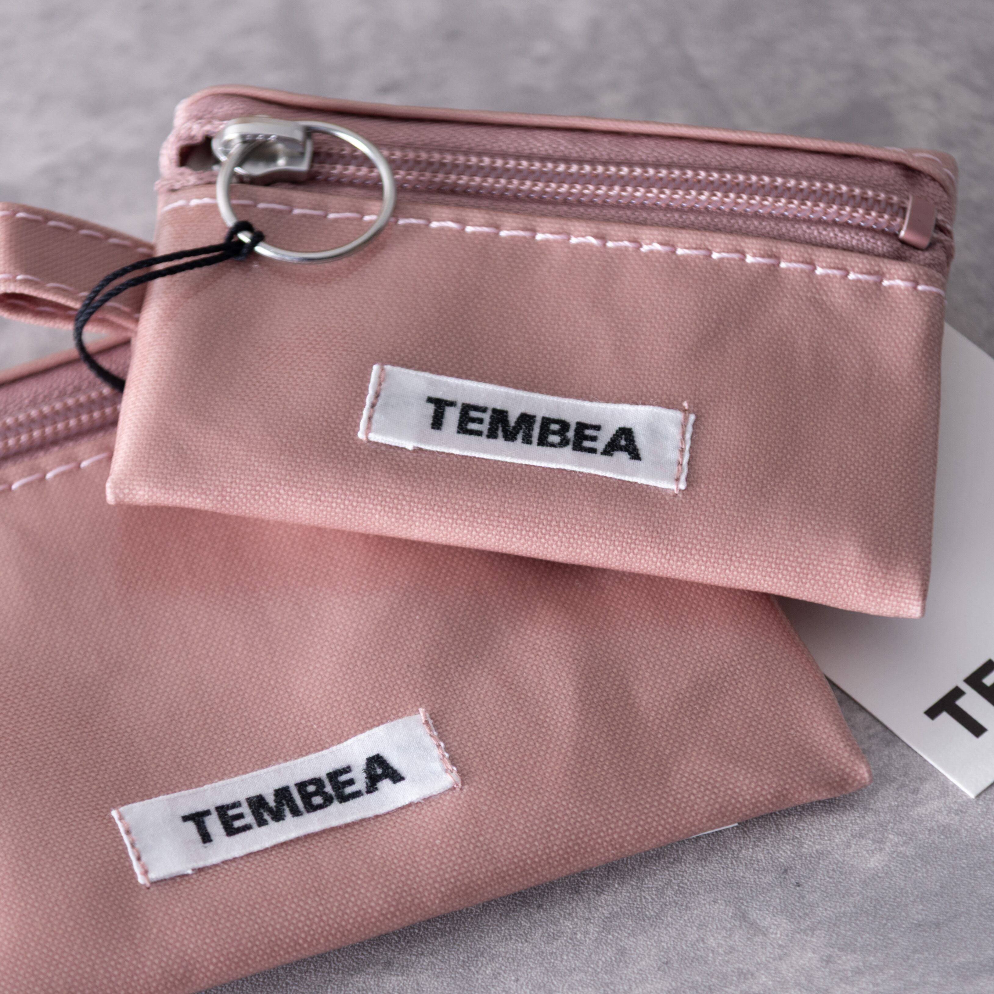 無地は本体表面に、チェックは側面にTEMBEAのロゴタグ付き。