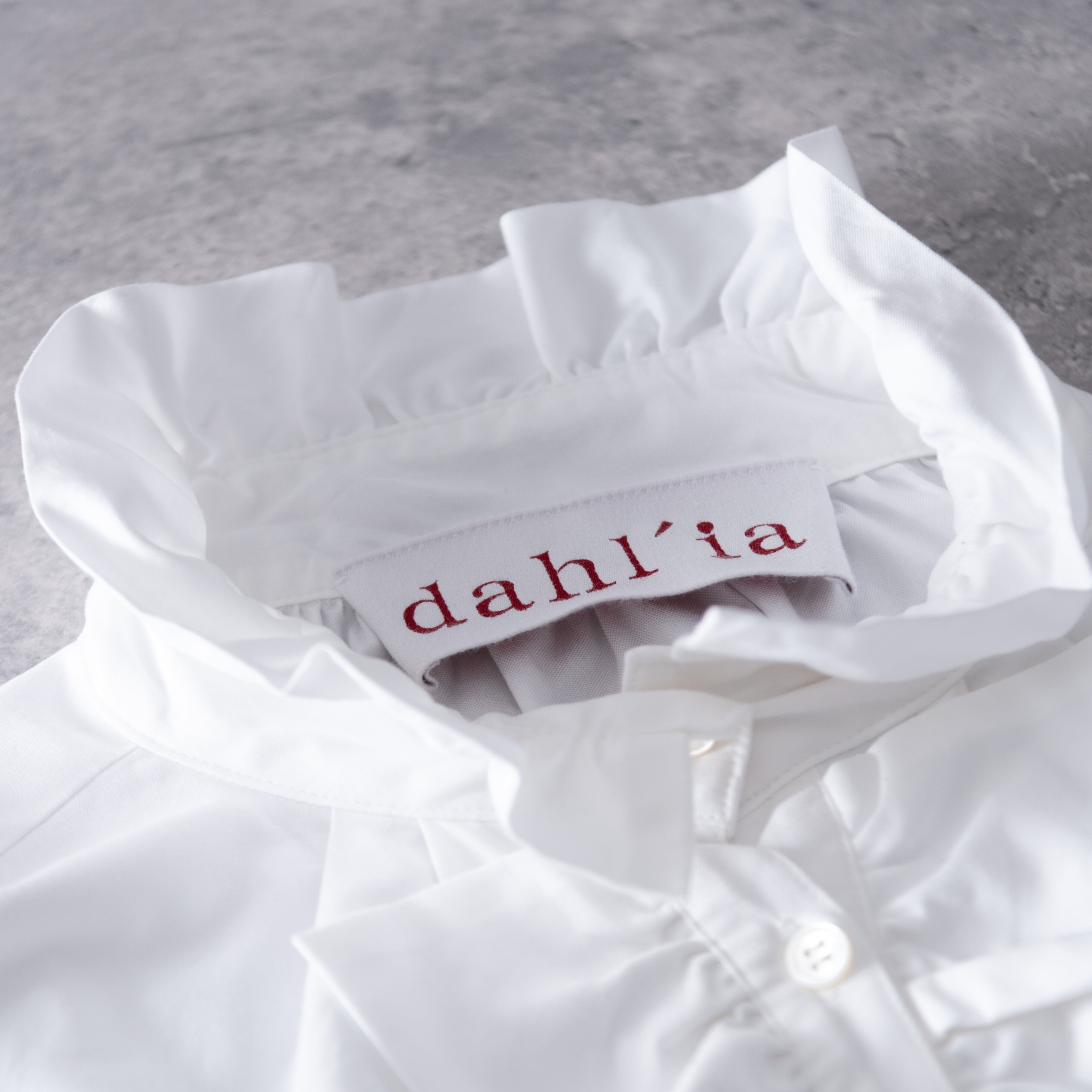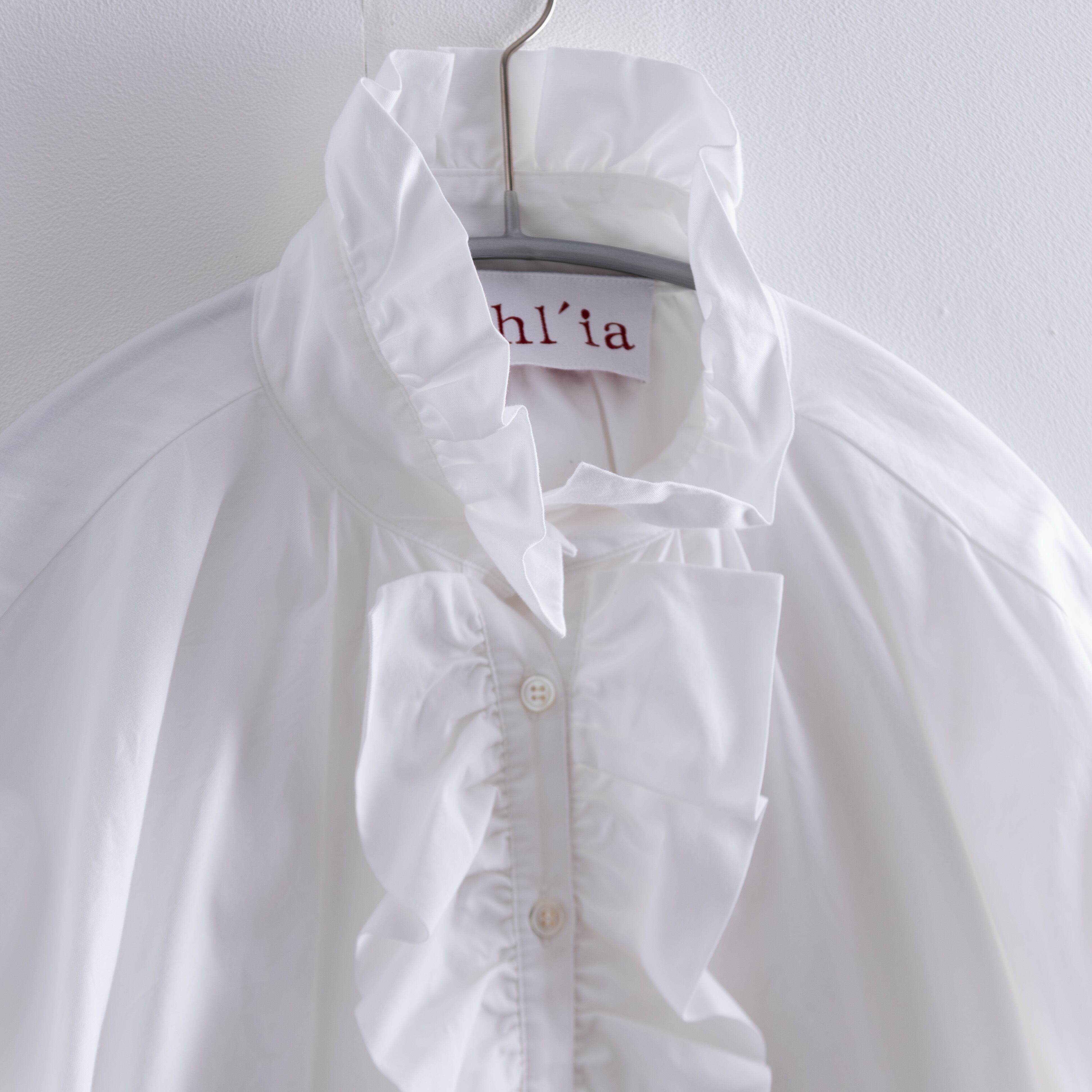 顔まわりを華やかに彩るフリルの襟元が、品のあるフェミニンさをプラス。
