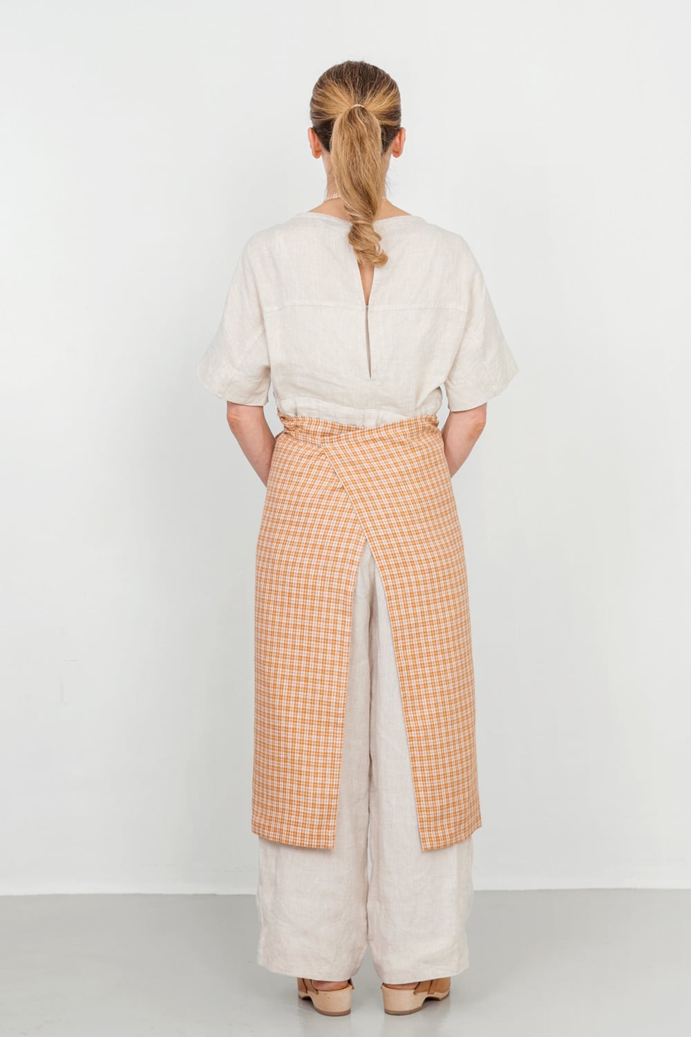 ポケットは中央に。胸当ての部分を内側におりこんで、サロンエプロン風にも使えます。