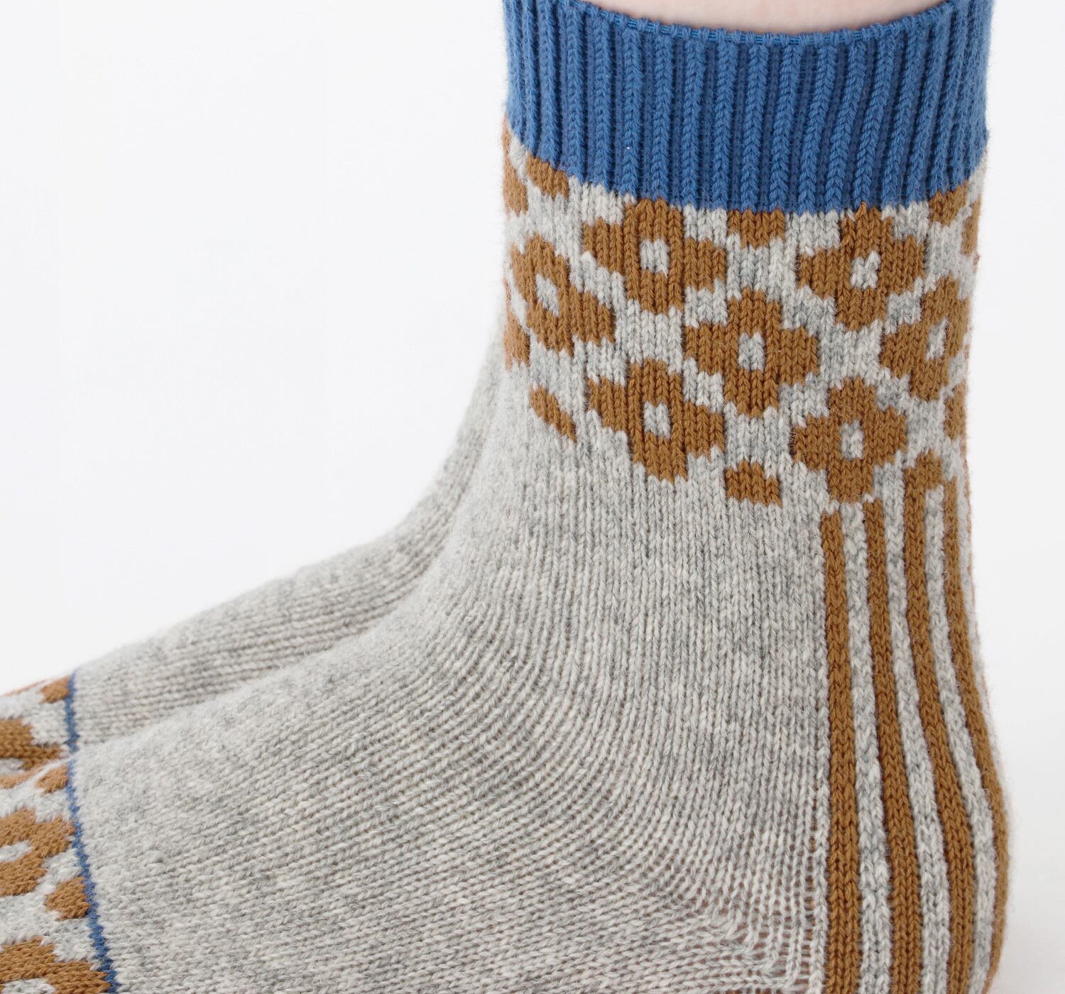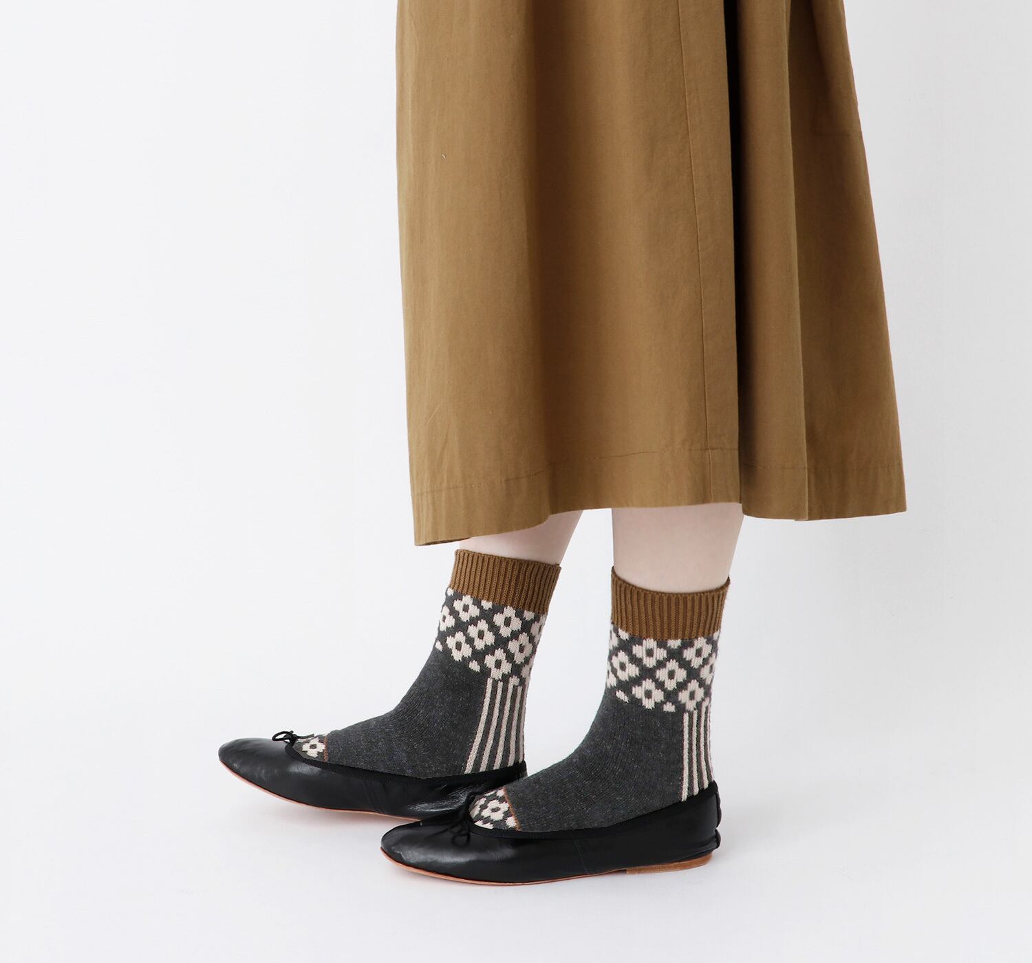 メリノウールのリサイクルウールにラムを混ぜたソフトで膨らみのある糸をベースに程よい厚みに編み立てました。コーディネートのポイントになる1足です。