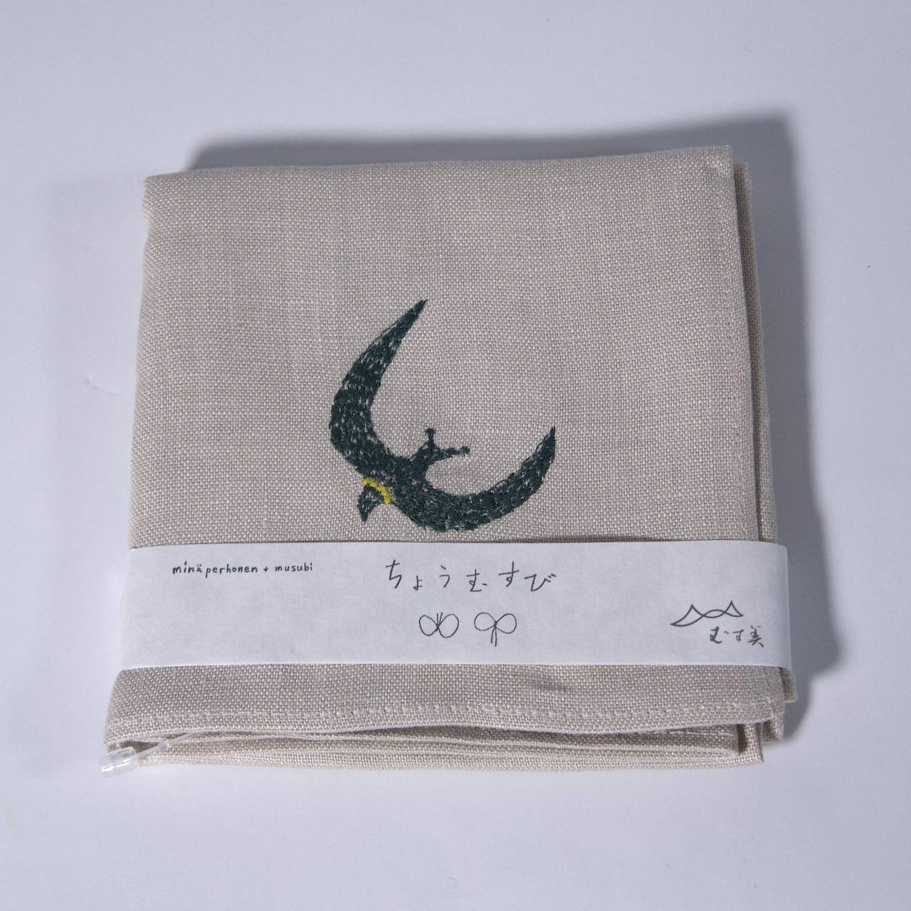 柔らかい手触りのフレンチリネンにミナ ペルホネンの手描きの図案をもとにしたワンポイント刺繍を施しました。